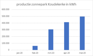 Met de productie van het Zonnepark gaat het ons voor de ‘wind’ met een record aantal zonne-uren en het lengen van de dagen. In onderstaande grafiek is te zien wat de opbrengst is. Er wordt naarstig gesleuteld aan de mogelijkheid om op elk willekeurig moment via de website te kunnen zien wat de opbrengst in kWh’s is. Tot die tijd houden we u op de hoogte met een grafiek als onderstaand.